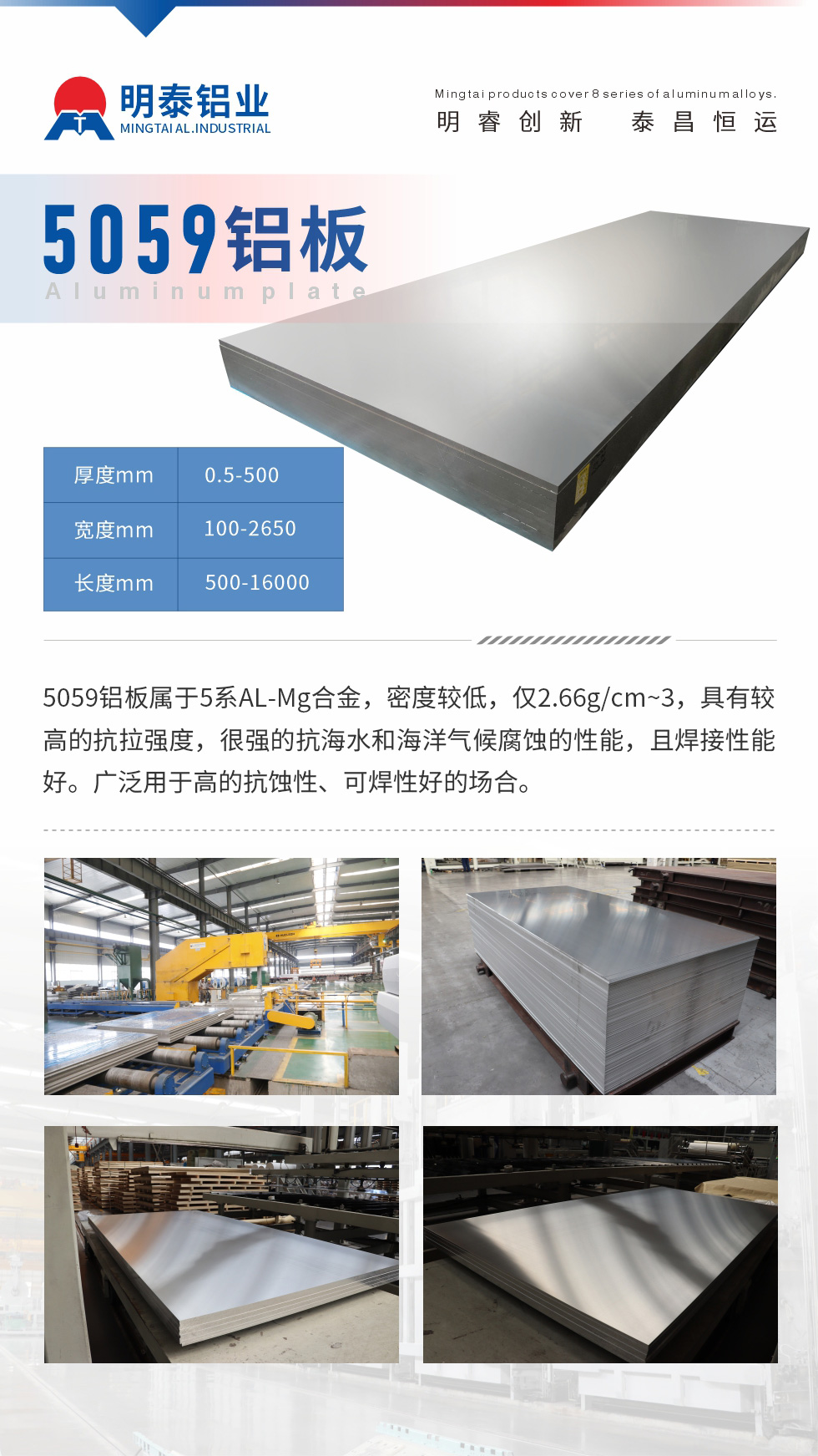 5059鋁板是5系合金,被廣泛應用到船舶、罐車、壓力容器等多方面,5059船用鋁板有什么樣的優勢呢?5059船用鋁板價格多少錢1噸?咨詢明泰鋁業0371-6789-8708